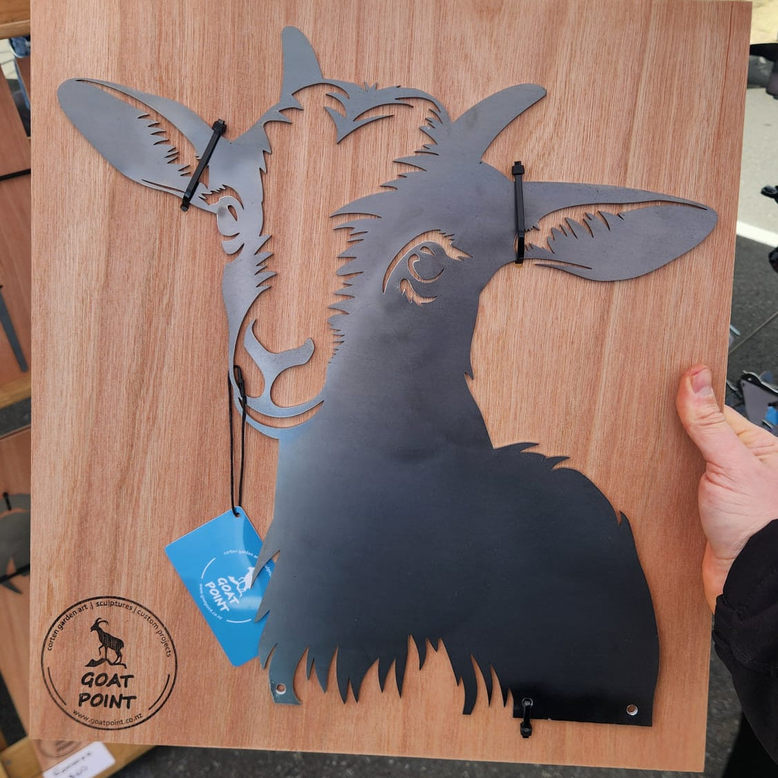 Crafted from corten weathering steel (more on corten here), this wall-mounted artwork shows a mischievous little goat that’s up to no good.